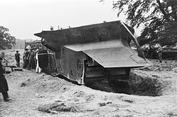 Diseñado por la Dirección de Desarrollo de Armas Diversas del Almirantazgo británico, este artefacto, con aspecto de carruaje, estaba destinado a romper las robustas defensas alemanas en Normandía. Cohetes fijados al borde de las dos ruedas impulsaban el dispositivo. Un tambor se llenaba de explosivos en el centro. Esta gran máquina, conocida como el Panjandrum, estaba diseñada para impactar las defensas enemigas y explotar. Esto potencialmente crearía una brecha lo suficientemente grande como para que un tanque pudiera atravesarla.